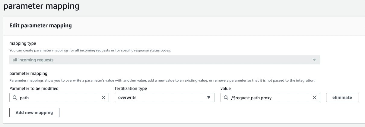 HTTP에서 연결된 API는 실제로 /domain이라는 패스를 가지고 있지 않다. http://test.com/test 라는 패스를 가지고 있다. 이때, HTTP 통합은 http://test.com/{proxy} 이렇게 routing에서 사용한 proxy 변수를 이용함으로써 /domain을 제외하고 {proxy} 부분의 패스만 넘겨줄 수 있다.