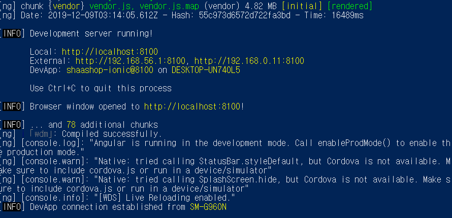 - ionic 서버가 8100번 포트로 실행된 것을 확인할 수 있습니다.