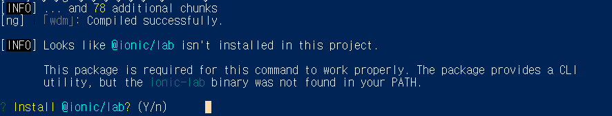 - 위에서 확인했던 localhost:8100으로 실행했다는 알림이 나오고, 수 초 후에 ionic lab을 설치하겠냐는 질문을 던집니다. Y를 입력하여 설치를 진행합니다.