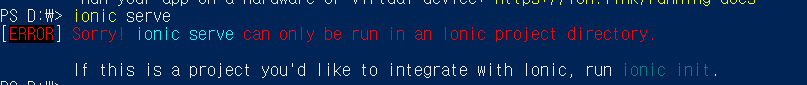 - ionic 앱이 아닌 곳에서 명령어를 실행하면 아래 그림처럼 출력합니다.